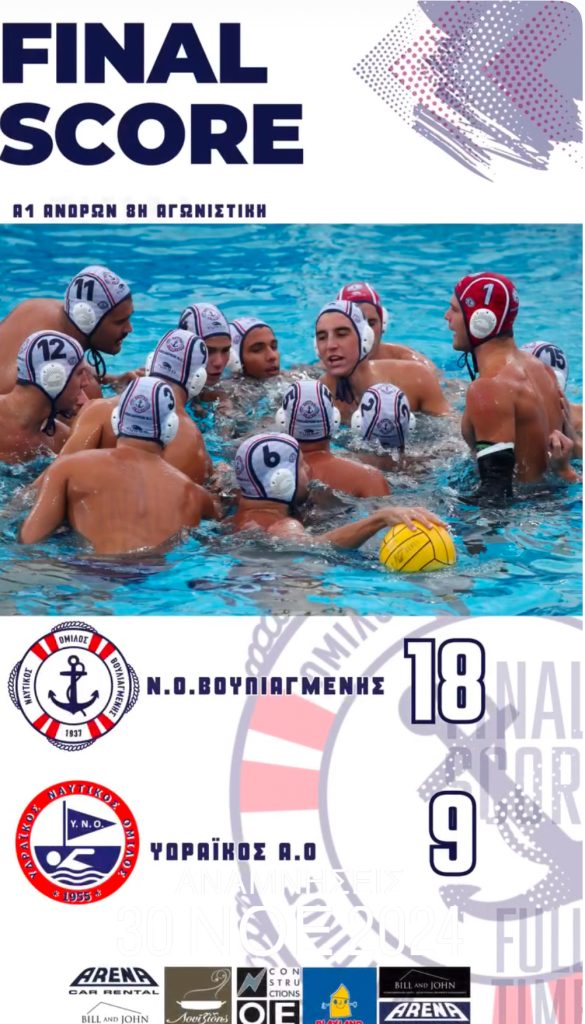 O ΝΟ Βουλιαγμένης, επικράτησε εύκολα του Υδραϊκού με 18-9 στο κολυμβητήριο του Λαιμού, για την 8η αγωνιστική του πρωταθλήματος υδατοσφαίρισης της Α1 Ανδρών.