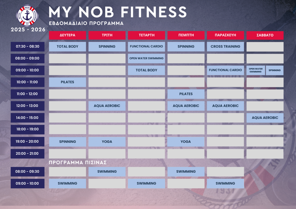 Το πρόγραμμα “my NOB fitness” περιλαμβάνει μια πλούσια γκάμα δραστηριοτήτων, σχεδιασμένων να καλύψουν όλες τις ανάγκες και προτιμήσεις των μελών. Οι αθλητικές δραστηριότητες που εντάσσονται στο πρόγραμμα είναι: