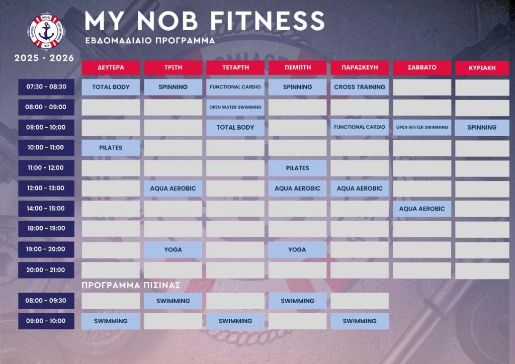 Το πρόγραμμα “my NOB fitness” περιλαμβάνει μια πλούσια γκάμα δραστηριοτήτων, σχεδιασμένων να καλύψουν όλες τις ανάγκες και προτιμήσεις των μελών. Οι αθλητικές δραστηριότητες που εντάσσονται στο πρόγραμμα είναι:
